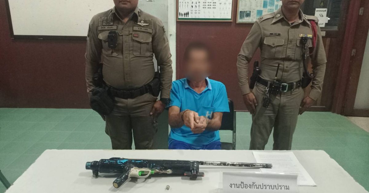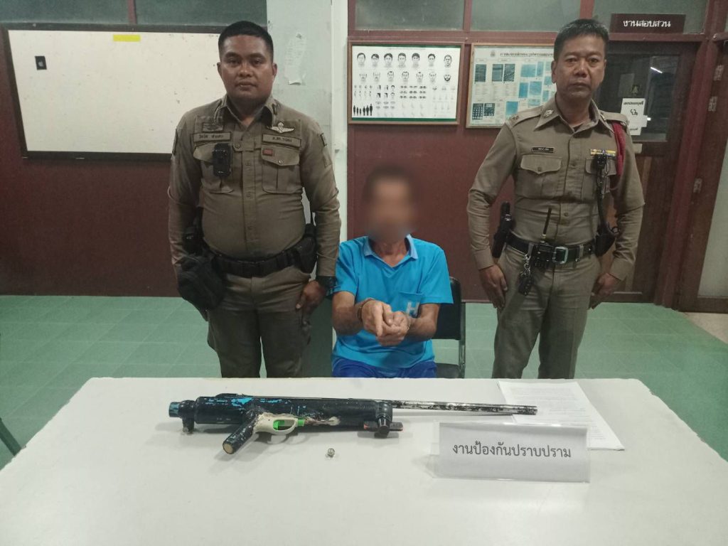 ร.ต.ต.พิทักษ์ มีนิล รอง สว.(ป.)สภ.กระบุรี ร้อยเวร 20 ร่วมสายตรวจตำบลสองแพรก พร้อม ว.30 ว.4 รับแจ้งใช้อาวุธปืนยิงไก่ บริเวณ บ้านเลขที่ 125 ม.10 ต.ลำเลียง อ.กระบุรี จ.ระนอง พบผู้ต้องหา ชาย 1 ราย พร้อมอาวุธปืนของกลาง