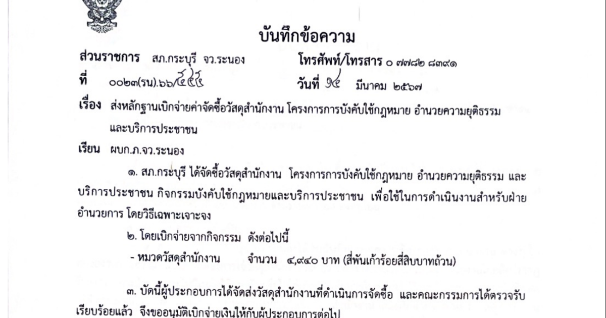 หลักฐานเบิกจ่ายค่าซื้อวัสดุสำนักงาน โครงการบังคับใช้กฎหมาย อำนวยความยุติธรรม และบริการประชาชน ปีงบ 2567 26 เมษายน 2567 โดย kraburi_wp / ข่าวจัดซื้อจัดจ้าง,ข่าวประชาสัมพันธ์,ข่าวจัดซื้อจัดจ้าง,งานการเงินและพัสดุ,ข่าวจัดซื้อจัดจ้าง,งานงบประมาณแผนงาน